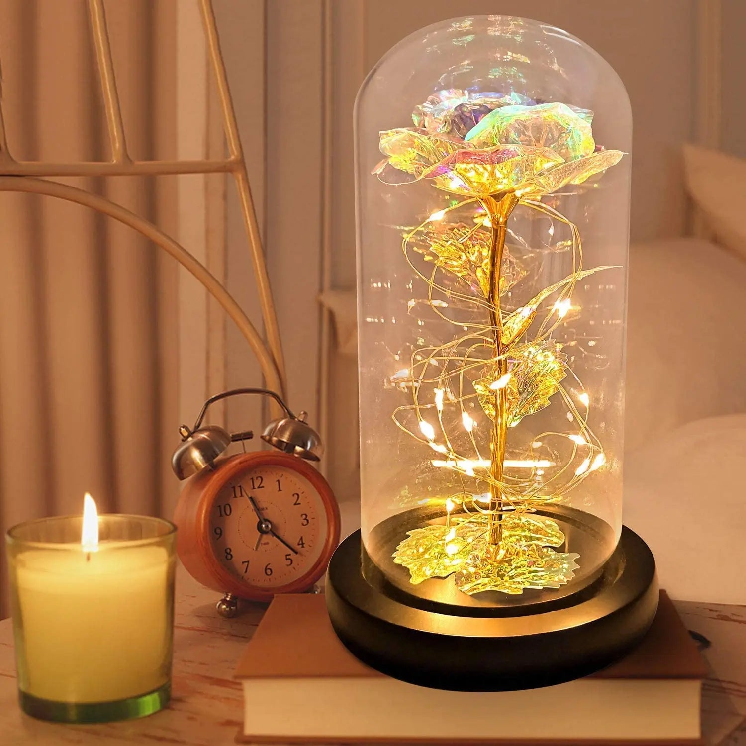 Starannie wykonana róża dekoracyjna umieszczona w eleganckiej szklanej kopule zachwyca swoim blaskiem każdego dnia.